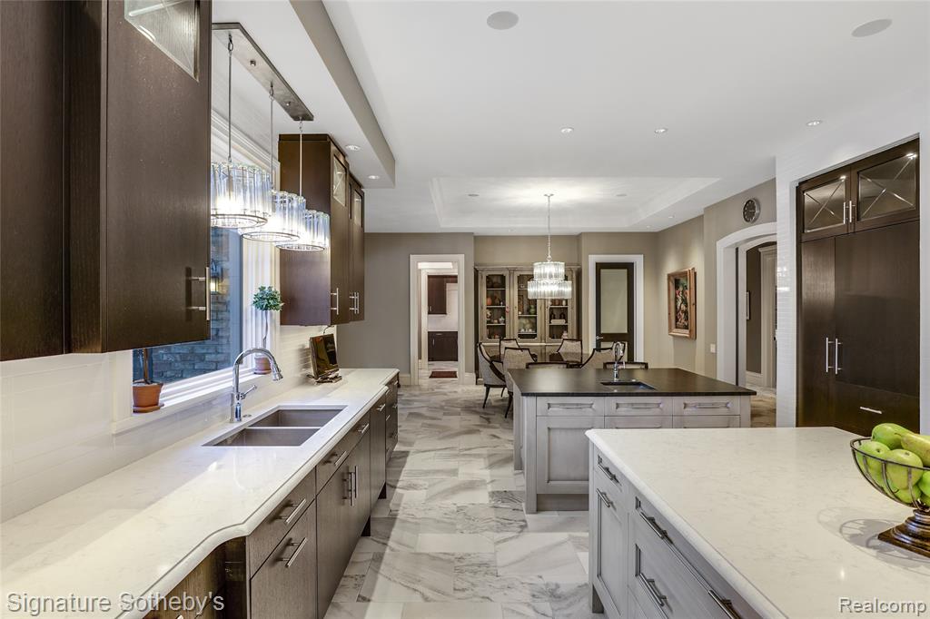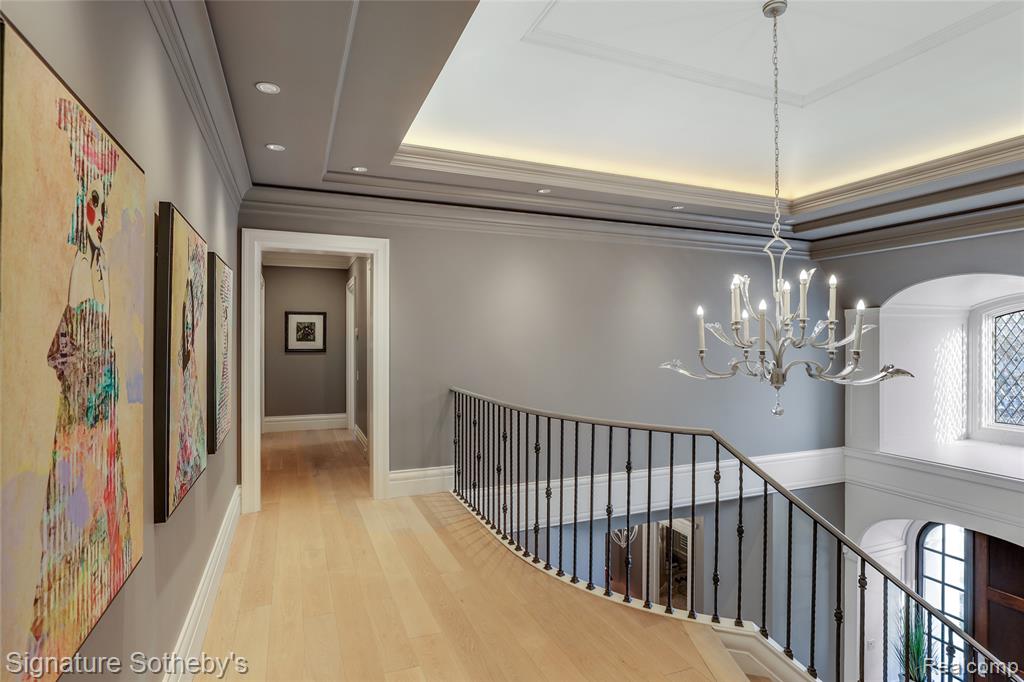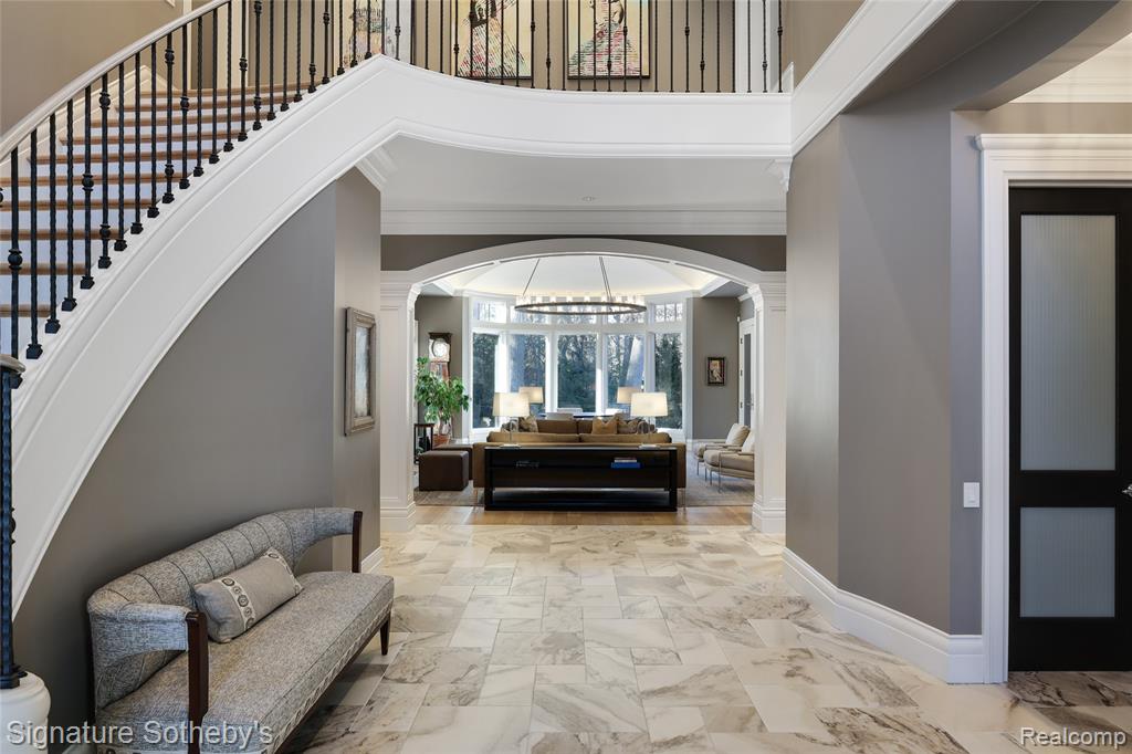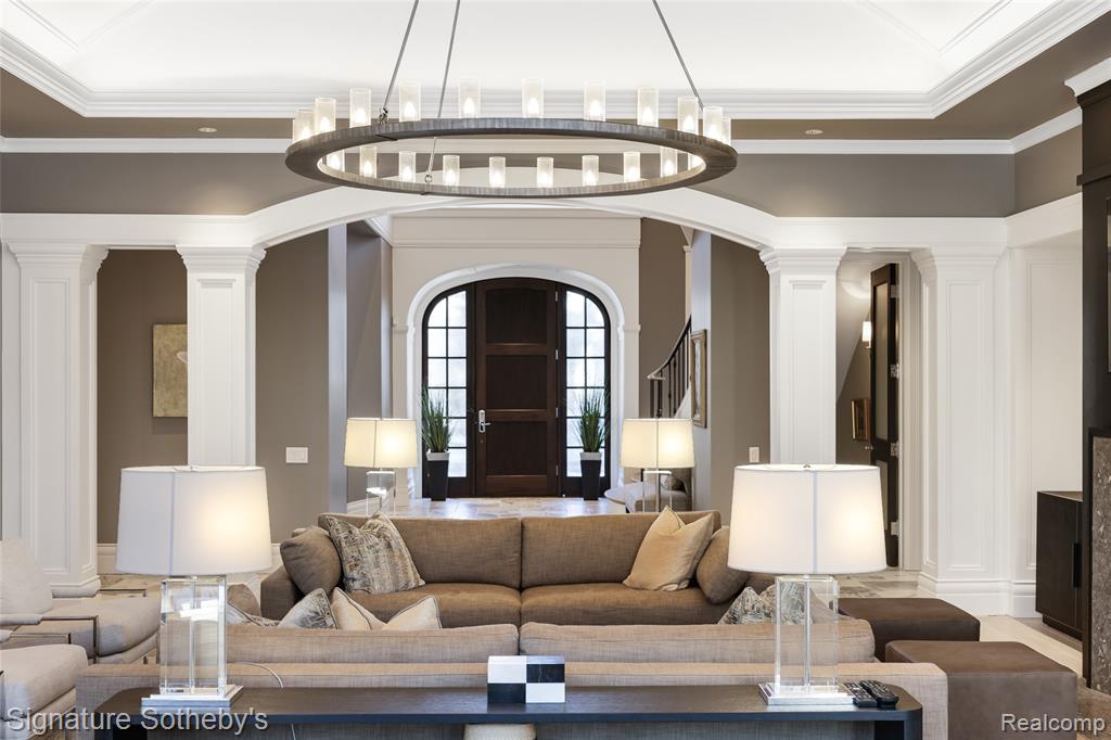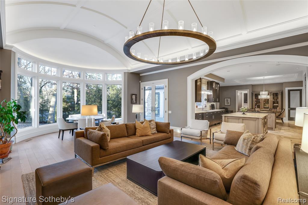 Set on 1.1 acres in a private Bloomfield Hills cul-de-sac, this residence offers 5,919 square feet of refined living with 4 bedrooms and 4.3 bathrooms. Designed by architect Lou DesRosiers and built by Derocher, the home balances timeless form with exceptional function. Italian porcelain flooring introduces the foyer, while intricate moldings and carefully curated finishes elevate every space. A Downsview kitchen anchors the main level, featuring dual islands, Wolf ranges, premium appliances, and a concealed pantry. The layout flows into a light-filled dining nook and living room, where floor-to-ceiling bay windows and a central fireplace establish an elegant focal point. A richly appointed mahogany library, crafted by Vogue Furniture, offers bespoke cabinetry and its own fireplace, while the formal dining room stands ready for elevated entertaining. The main-level primary suite is a retreat unto itself, complete with built-in illuminated closets and a spa-quality bath featuring dual vanities, soaking tub, and walk in shower. Upstairs offers three well-appointed bedroom suites. A dedicated laundry room provides added convenience on the second level. A fully finished lower level provides flexible space for recreation, hosting, or storage. Outdoors, a covered lanai and secluded backyard encourage seamless indoor-outdoor living. The exterior pairs handmade brick with a cedar shake roof, blending texture and timeless character. Additional features include built-in mudroom lockers, heated four-car garage, integrated speaker system, a partial home generator, and much more. A thoughtfully executed residence where craftsmanship and comfort meet with quiet confidence. |
