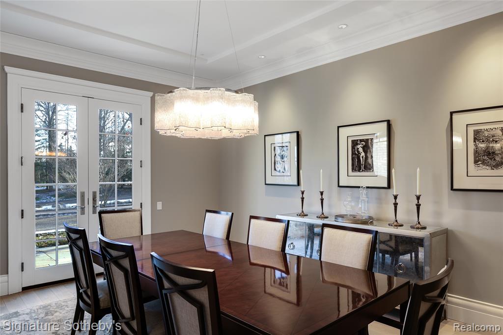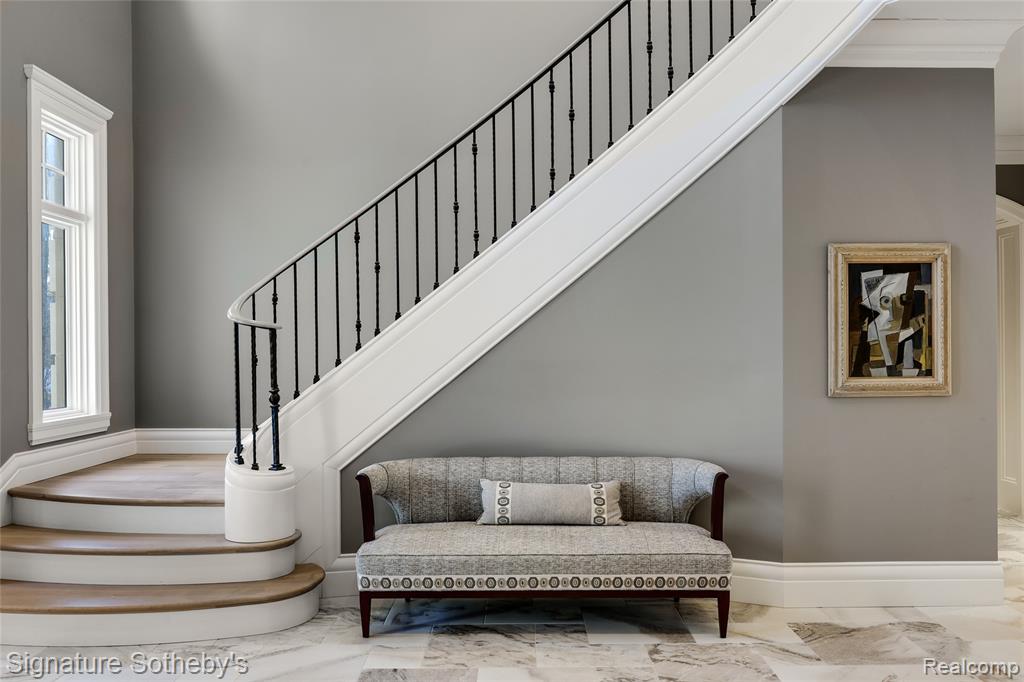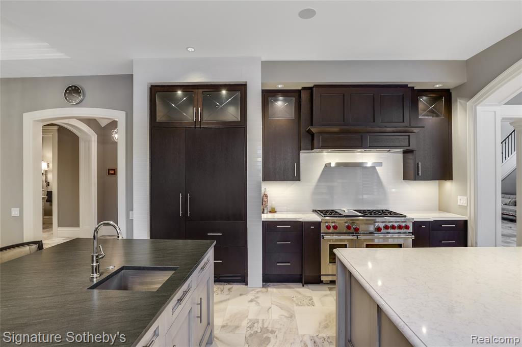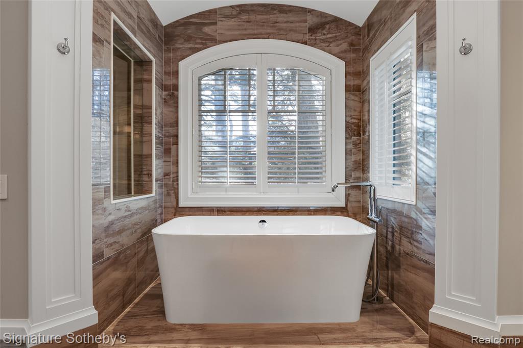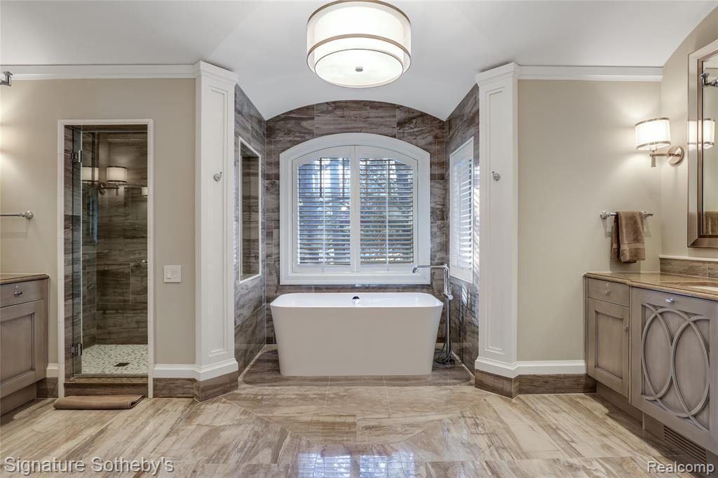 Set on 1.1 acres in a private Bloomfield Hills cul-de-sac, this residence offers 5,919 square feet of refined living with 4 bedrooms and 4.3 bathrooms. Designed by architect Lou DesRosiers and built by Derocher, the home balances timeless form with exceptional function. Italian porcelain flooring introduces the foyer, while intricate moldings and carefully curated finishes elevate every space. A Downsview kitchen anchors the main level, featuring dual islands, Wolf ranges, premium appliances, and a concealed pantry. The layout flows into a light-filled dining nook and living room, where floor-to-ceiling bay windows and a central fireplace establish an elegant focal point. A richly appointed mahogany library, crafted by Vogue Furniture, offers bespoke cabinetry and its own fireplace, while the formal dining room stands ready for elevated entertaining. The main-level primary suite is a retreat unto itself, complete with built-in illuminated closets and a spa-quality bath featuring dual vanities, soaking tub, and walk in shower. Upstairs offers three well-appointed bedroom suites. A dedicated laundry room provides added convenience on the second level. A fully finished lower level provides flexible space for recreation, hosting, or storage. Outdoors, a covered lanai and secluded backyard encourage seamless indoor-outdoor living. The exterior pairs handmade brick with a cedar shake roof, blending texture and timeless character. Additional features include built-in mudroom lockers, heated four-car garage, integrated speaker system, a partial home generator, and much more. A thoughtfully executed residence where craftsmanship and comfort meet with quiet confidence. |