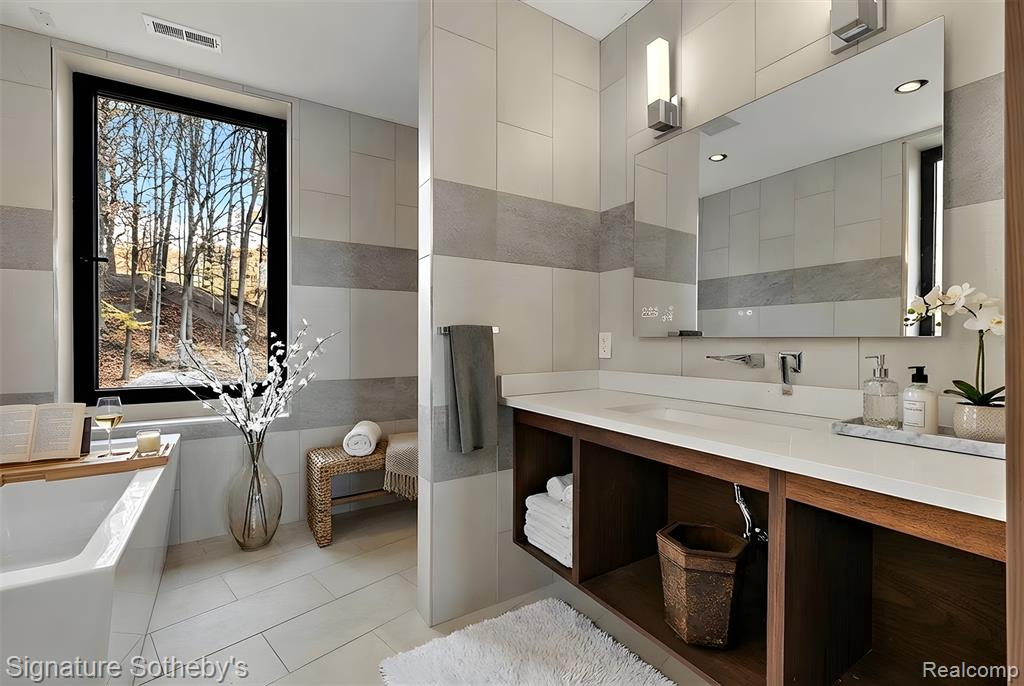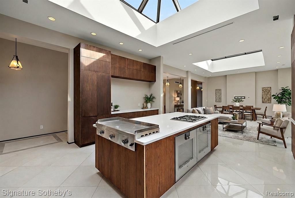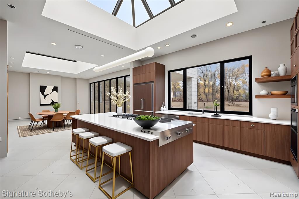 An extraordinary opportunity to complete a truly one-of-a-kind, architect-designed estate in Northville Township, privately set on 2.93 acres. This custom courtyard-style ranch is built with insulated concrete form (ICF) walls and precast hollow-core concrete plank floors, delivering exceptional strength, efficiency, and a level of quiet comfort rarely found in residential homes. Designed for refined living, the residence features geothermal HVAC with radiant heated and cooled floors throughout, Luma solar roof panels with a titanium roof and 25-year warranty, soaring 10’+ ceilings, and striking vaulted and domed architectural details, all wrapped in a sophisticated EIFS exterior.